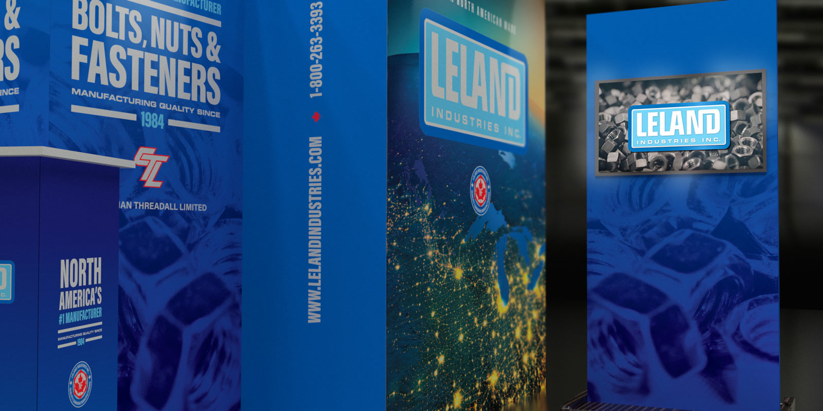 We took their North American pride and beautiful blue hues and created a banner stand system that was modular, with multiple configurations that could fold up, slide around, and make the other manufacturers even more jealous of Leland.